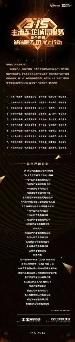 2024(第十九届)中国汽车金扳手奖评选活动起始于“3·15”车企诚信服务联合声明。在“3·15”国际消费者权益日来临之际,由《中国汽车市场》杂志社、汽车与驾驶维修传媒联合国内31家车企携手发起2024“3·15”车企诚信服务联合声明。这是该声明活动连续第6年举办,得到了国内各大主流车企、行业协会、业内媒体及广大消费者的支持和参与。参与联合声明的车企携手共铸行业诚信服务体系,共同表达“诚信服务,用‘心’行动”之决心,彰显了汽车服务领域的中国力量!