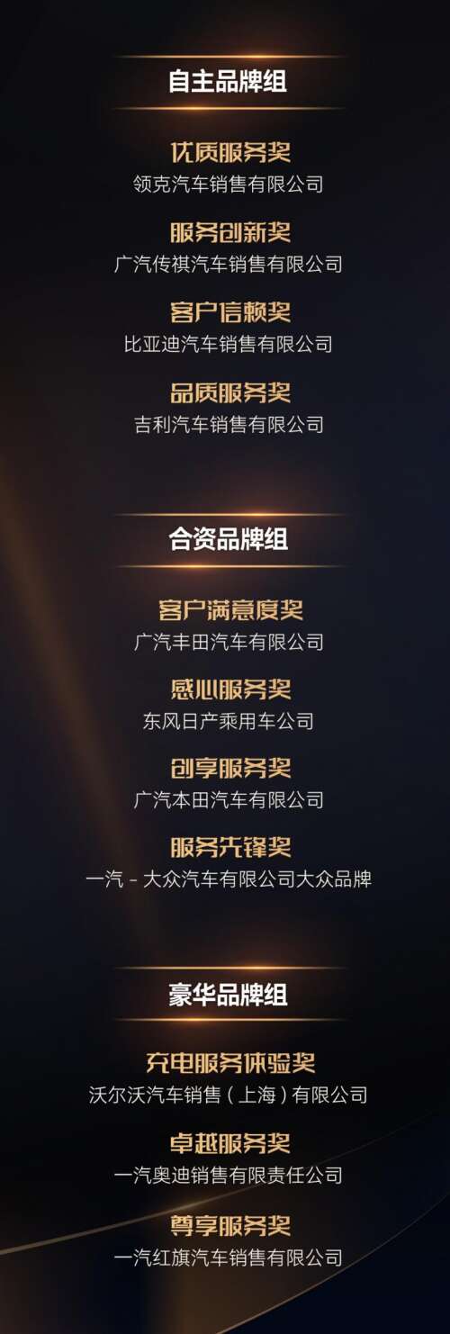 2024(第十九届)中国汽车金扳手奖评选最终设置了3个组别,分别为:自主品牌、合资品牌、豪华品牌。其中,领克汽车、广汽传祺、比亚迪汽车、吉利汽车获得自主品牌组分项奖,广汽丰田、东风日产、广汽本田、一汽-大众大众品牌获得合资品牌组分项奖,沃尔沃汽车、一汽奥迪、一汽红旗获得豪华品牌组分项奖。
