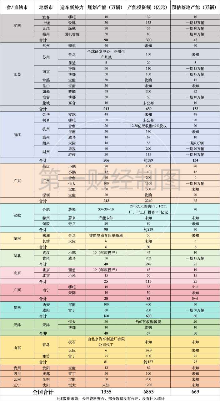 另外,广东省因为宝能和恒大两家“大干快上”的企业,累计规划年产能和累计规划投资额分别达到了240万辆和2200亿元。