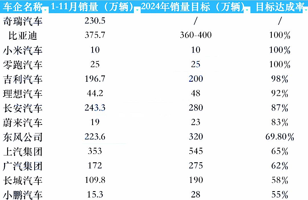 从完成销量目标的车企来看,比亚迪前11个月销量为375万辆,已超过360万辆的目标;零跑汽车前11个月销量为25万辆,已达到25万辆的目标。