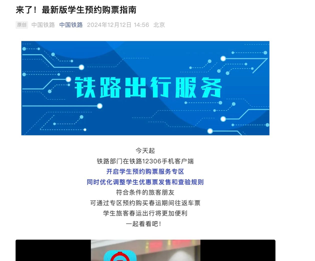 同时,自12月12日起,铁路部门在铁路12306手机客户端开启学生预约购票服务专区,同时优化调整学生优惠票发售和查验规则,符合条件的旅客朋友可通过专区预约购买春运期间往返车票,学生旅客春运出行将更加便利。