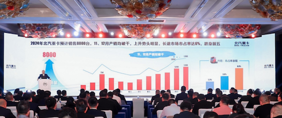 北汽重卡在不到两年的时间里成功实现长途干线市占率6%,挺进行业第五,收获了万名高质量用户,打下坚实的用户基础。2024年北汽重卡发展趋势昂扬向上,全年预计销售8000台,其中11月产销双破千,海外市场成果喜人,国内、海外实现了双突破,前景广阔。