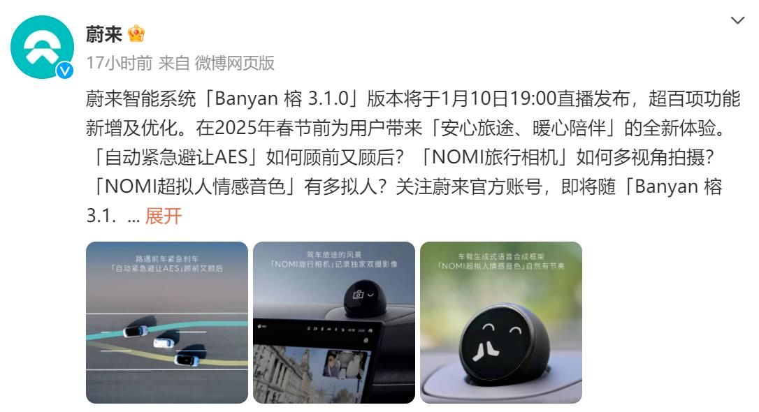 1月10日消息, 蔚来官方于日前在社交平台宣布,蔚来智能系统“Banyan榕3.1.0”版本将于1月10日19:00通过直播发布,预计将提供超百项功能新增及优化。官方表示,新版本系统预计将在2025年春节前推送。
