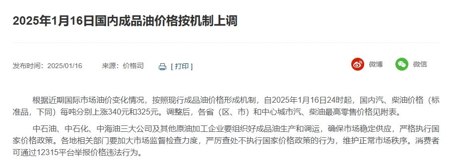 中新经纬1月16日电 国家发展改革委网站发布公告,根据近期国际市场油价变化情况,按照现行成品油价格形成机制,自2025年1月16日24时起,国内汽、柴油价格(标准品,下同)每吨分别上涨340元和325元。
