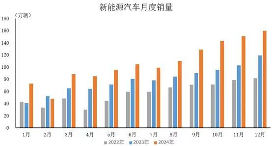特别是在12月份,新能源汽车当月产量达到153万辆,销量达到159.6万辆,同比分别增长30.5%和34%。其中,国内销量环比增长2.4%,同比增长35.4%,显示出市场对新能源汽车的强劲需求。