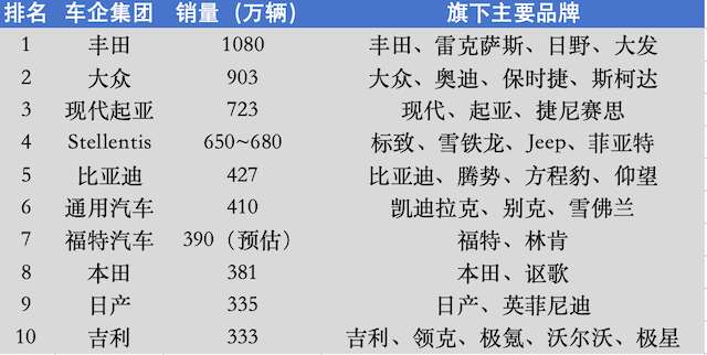 曾经拿下多次年销冠军的大众集团销量为903万辆,位居第二。现代起亚汽车集团年销量723万辆,排名全球第三;Stellantis集团(含标致、雪铁龙、Jeep、菲亚特)守住了全球第四的宝座,年销量预估为650万~680万辆。