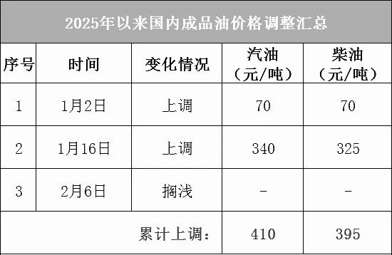 自2025年1月16日国内成品油价格调整以来,国际市场油价波动运行,按现行国内成品油价格机制测算,2月6日的前10个工作日平均价格与1月16日前10个工作日平均价格相比,调价金额每吨不足50元。根据《石油价格管理办法》第七条规定,本次汽、柴油价格不作调整,未调金额纳入下次调价时累加或冲抵。