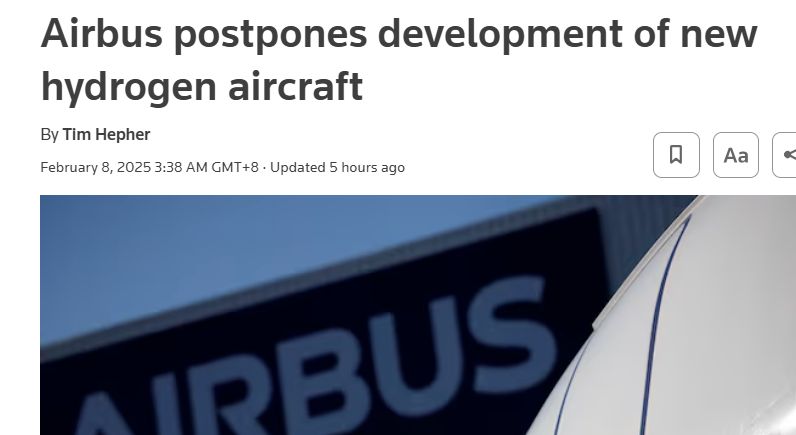 2025年2月8日,据路透社消息,近日,空中客车公司宣布,由于技术发展速度低于预期,该公司将推迟原定于本世纪30年代中期的氢动力商用飞机开发计划至下个十年中期。
