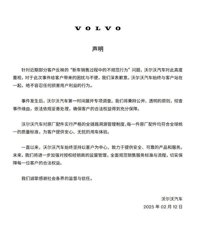 沃尔沃汽车表示,“对于此次事件给客户带来的困扰与不便,我们深表歉意。沃尔沃汽车始终与客户站在一起,绝不容忍任何损害用户利益的行为。”