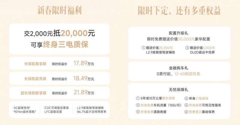 2025年开年之际,为推动“科技普惠”,岚图知音也推出新春贺岁订购礼和限时权益等。2月28日前下定,可享2000元抵20000元限时抵扣,长续航智享版、长续航超充版、超长续航智享版的限时权益价分别为17.89万、18.49万和21.89万。在此基础上,岚图知音官方还推出包括终身三电质保的三大购车好礼。同时,还能叠加2025年国补政策。