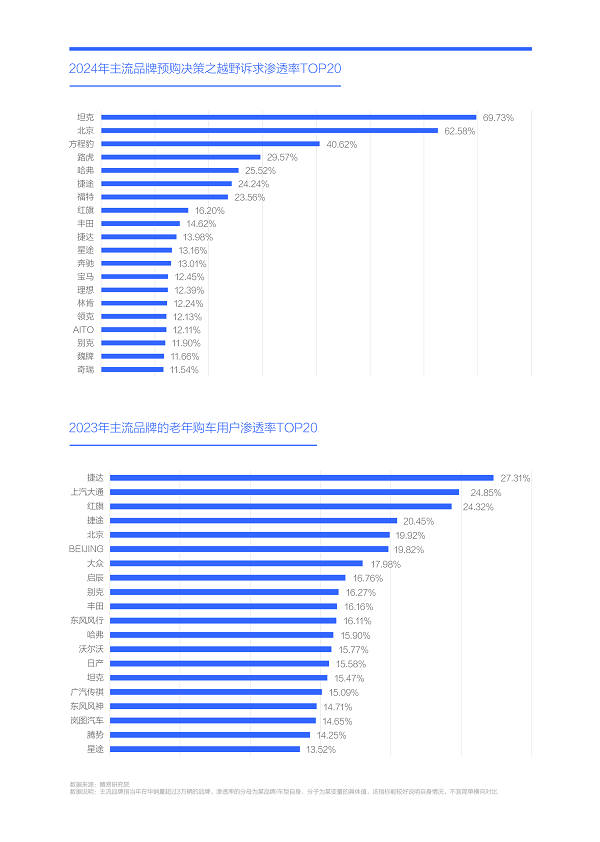 结合当下有关越野场景的主流分类,腾易研究院将越野诉求定义为用户在购车过程中对车辆应对山地、雪地、沙漠等各种复杂路况所需的穿越、脱困、涉水等性能的要求。本报告的研究数据以腾易研究院的线上调研为主,2024年的总样本量超过7万份,并以腾易大数据和腾易研究院的线下调研数据为参考。