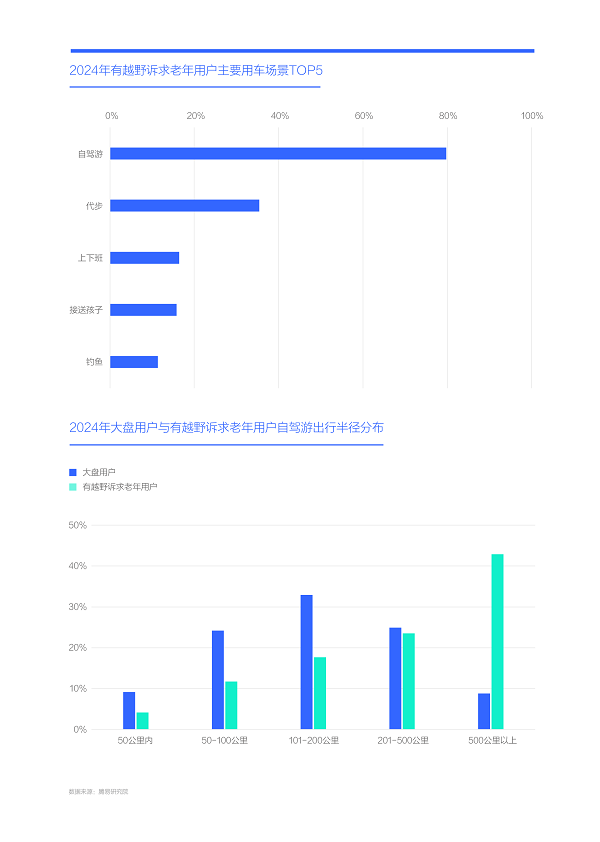 调研发现由有越野诉求的老年用户组成的“新老头乐车市”,与“传统老头乐车市”的用车场景有天壤之别:前者以自驾游绝对为主,2024年占比近80%,遥遥领先于代步、上下班、接送孩子等其它场景;从有越野诉求老年用户的自驾游半径看,会让人惊掉下巴,2024年近45%的出游半径超过500公里,属于典型的长途自驾游。大盘用户超过500公里的占比不及10%,多数集中于200公里以内,属于典型的短途游,甚至是城郊游;