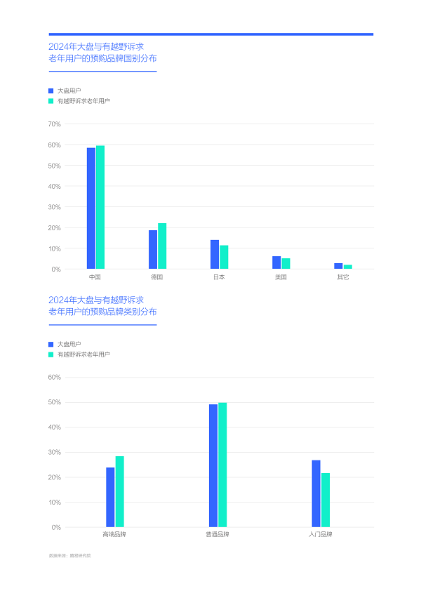 2024年坦克领衔越野诉求排行榜,主打越野硬朗型、大气高端型的不少品牌也位列TOP20。2025-2026年,越野硬朗型和大气高端型将成为主流车企产品布局与中国车市竞争的重点领域,争夺将瞬间白热化,售价将加速下探,从而吸引更多有越野诉求的老年用户,助力“新老头乐车市”发展;