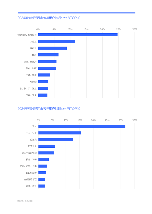 调研发现由有越野诉求的老年用户组成的“新老头乐车市”,与“传统老头乐车市”的用户结构有天壤之别:从行业分布看,2024年“新老头乐车市”的党政机关和事业单位的占比近25%,遥遥领先于制造业、采矿业、能源等其它行业;从职业分布看,2024年“新老头乐车市”的退休爷爷的占比超过30%,遥遥领先于工人、公务员、私营业主等其它职业;