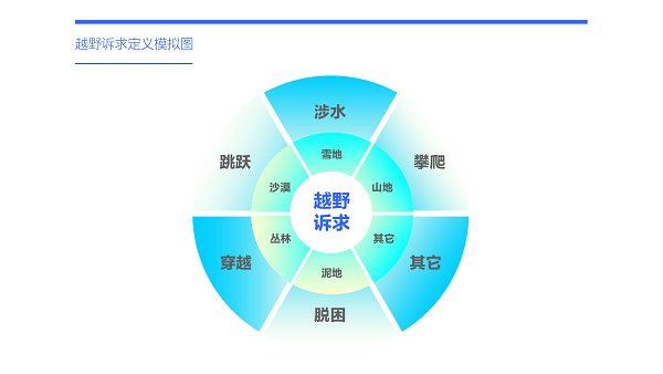 越野诉求:指用户在购车过程中对车辆应对山地、雪地、沙漠等各种复杂路况所需的穿越、脱困、涉水等性能的要求