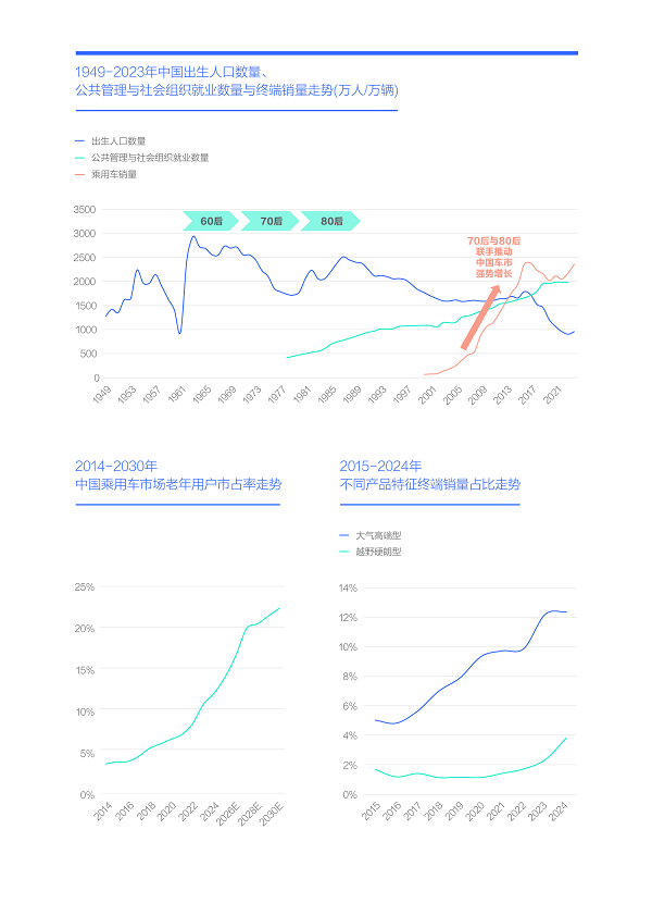 继60后,未来十年70后将紧随其后涌入“ 新老头乐车市”,十年后第一批小皇帝的80后,也将大规模涌入。由于70后与80后是助推近二十多年中国车市高歌猛进的主力,他们退休后,一定会释放出更强劲的购车需求,持续助推“新老头乐车市”发展。尤其是80后,他们充分受益于高校扩招与科技化浪潮,越野意识和消费能力进一步提升,十年后当80后成为第一批“老皇帝”时,“新老头乐车市”有望成为中国的新主流车市;