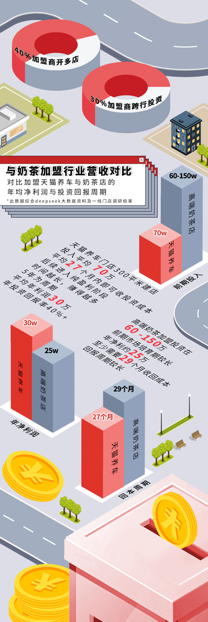 在竞争日益激烈的汽车后市场,天猫养车凭借领先的经营效率和确定的盈利模式给予了加盟商和投资者更多的信心。数据显示,40%老加盟商拓展了门店数量,30%加盟商跨行投资天猫养车,重新拾起了“金饭碗”。