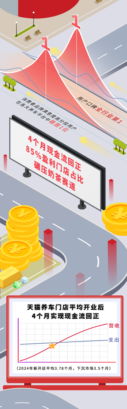 凭借供应链整合能力强,品牌化、标准化的经营优势。天猫养车为门店带来了极具确定性的盈利。天猫养车新店4个月内即可实现现金流回正,下沉市场平均3.5个月。一家300平米的天猫养车门店,建店投入约70万元,平均27个月内即可收回投资成本,后续进入纯盈利阶段。时间越长,赚得越多,5年为周期,平均年利润30万元,年投资回报率40%。