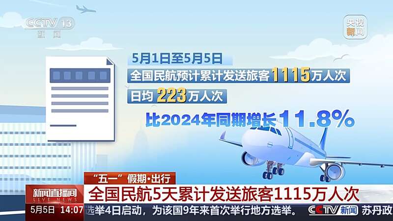 5月1日至5月5日,全国民航预计累计发送旅客1115万人次,日均223万人次,比2024年同期增长11.8%。预计累计保障航班9.1万班,日均18147班,比2024年同期增长5.5%。预计航班正常率89%,比2024年同期提高1.97个百分点。