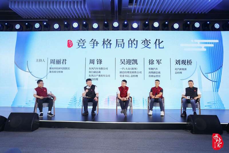 在“竞争格局变化”的议题中,东风汽车有限公司执行副总裁、东风日产乘用车公司副总经理周锋,一汽-大众(商务)副总经理及销售公司党委书记、总经理吴迎凯,零跑汽车高级副总裁、首席运营官徐军,北汽新能源总经理刘观桥,腾易研究院院长周丽君发表了自己的观点。大家在交流中提出,在当下的竞争格局中,企业要坚持长期主义,在符合市场规律和用户需求的前提下进行产品创新迭代,实现共享、共生、共赢。