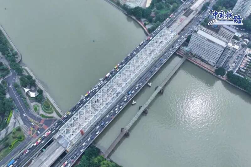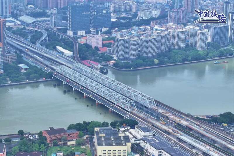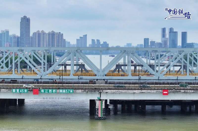 珠江四线特大桥正线全长4.9公里,共有墩台261个,桩基1982根,在原有的双线普速桥基础上,升级改造东桥,原位保护西桥,建设成为四线高速铁路桥。