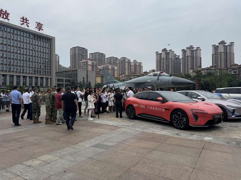 活动现场,奇观夺目。银灰色的歼10C战机,机身线条凌厉,全长近17米,重达6.7吨,与流线型设计的长安启源A07形成极具冲击力的视觉组合。在两辆启源Q07护航车的伴随下,这支特殊的“陆空编队”沿着预定路线在广场上进行沉稳巡行。军用顶尖装备与民用智能轿车的硬核同框,其突出的反差感,瞬间点燃了现场气氛。从上午9点半开始进行活动,随后歼10C在荣昌人民广场进行全天静态展示,直至夜间撤场。