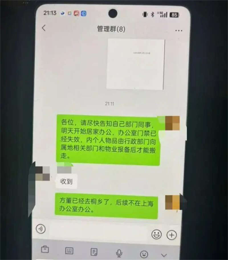 6月11日晚,哪吒汽车员工围堵董事长兼CEO方运舟刚搬迁的办公室讨薪。同样是6月12日,哪吒汽车内部宣布,员工自6月12日起居家办公,办公室门禁已经失效,员工搬离个人物品需由行政部门向属地相关部门和物业报备。而方运舟本人已离开上海总部,转赴哪吒汽车主要生产基地——浙江桐乡。