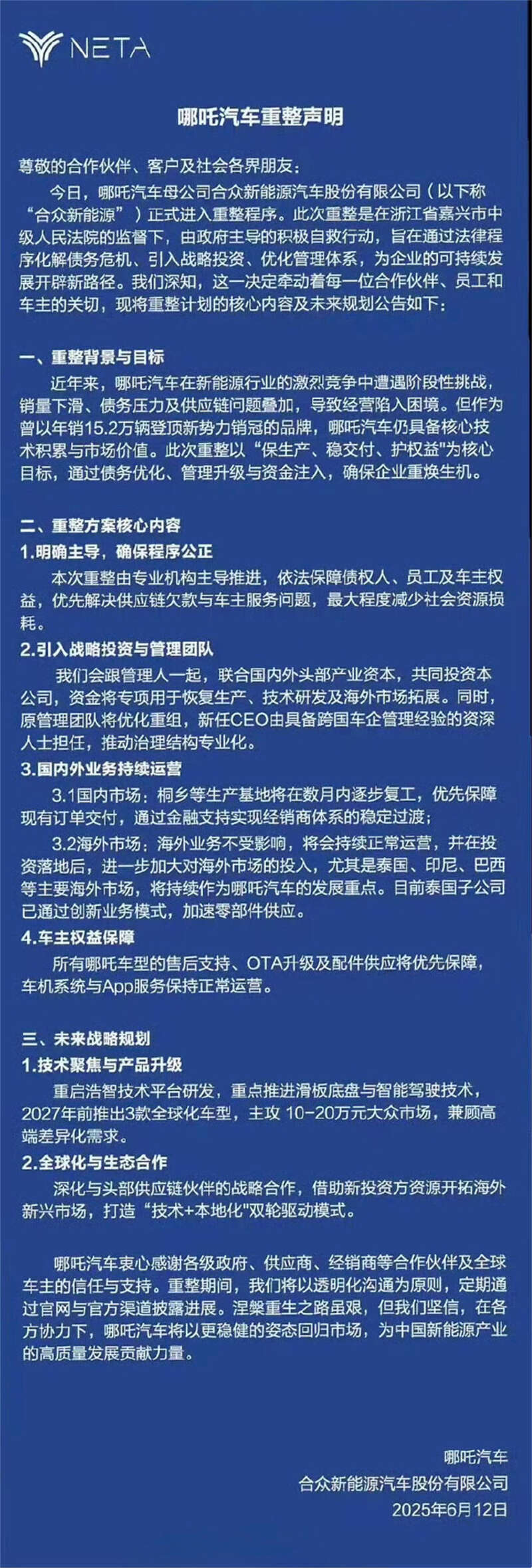 在声明中,哪吒汽车还承诺将联合国内外头部产业资本共同投资、优化重组原管理团队,并承诺国内外业务持续运营,桐乡等生产基地将在数月内逐步复工,售后支持、OTA升级及配件供应将优先保障,而海外业务不受影响,泰国、印尼、巴西等主要海外市场将持续作为发展重点。