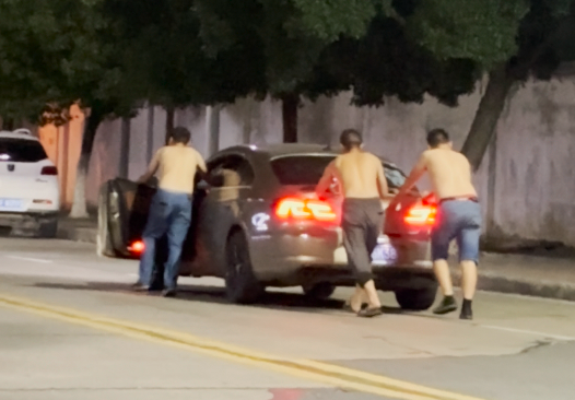 另外两名男子在车后推车