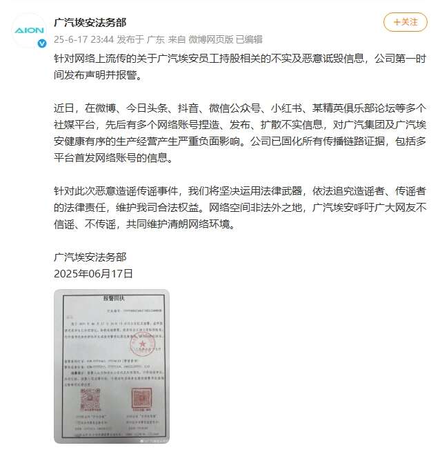 广汽埃安:就员工持股相关不实及恶意诋毁信息已报警