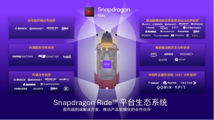 丰富功能的实现还得益于Snapdragon Ride平台拥有的强大且相互协同的生态系统。这一生态系统汇聚了多家合作伙伴,包括卓驭科技、Momenta、元戎启行、德赛西威、科博达、车联天下、畅行智驾和航盛等。合作伙伴们的专业技术和解决方案,进一步拓展了Snapdragon Ride的能力,强化了如物体检查、行人识别、实时决策等能力,并通过标准API与AI代理实现信息互通,支持包括高速与城市领航辅助驾驶、泊车辅助以及合规性管理等功能。