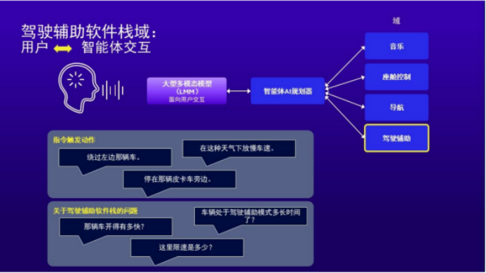 例如,用户可以直接通过语言来表达“停在那辆皮卡车旁边。”或“车辆处于辅助驾驶模式多长时间了?”这些指令或问题的背后,绝非简单的命令,而是包含情境理解和驾驶意图的复杂语言,智能体将实现车内多系统的协调,最终做出智能决策。