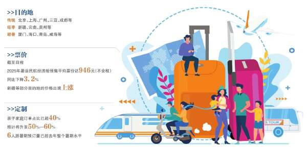暑期临近,境内游预订高峰已至。6月22日,北京商报记者从多家在线旅游平台及旅行社了解到,北京仍是暑期境内游最热门目的地,新疆、云南、贵州等地热度飙升。境内整体出游价格环比上涨,同比则保持稳定或微降;部分季节性目的地因资源有限价格小幅上涨,旅行社采购周期提前。今年暑期,亲子家庭和学生是主力客群,亲子订单占比超40%。深度体验需求增长显著:亲子家庭偏好“知识/技艺学习”及“亲近自然”类产品;学生群体更倾向城市自由行。为吸引游客,商家推出“私人飞机环游”“溯溪挖野菜”“莫高窟特窟研学”等差异化产品。