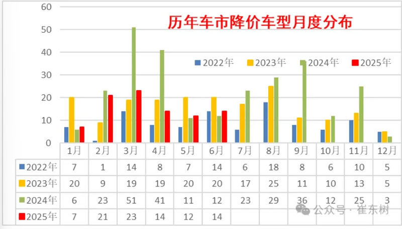 崔东树表示,2025年乘用车降价促销力度大幅降低,尤其是4至6月的降价车型大幅减少。2025年1月有7款车型降价,2月有21款车型降价, 3月的降价车型数量相对于历史来看也是23款的较高的水平,而4月仅有14款车型降价,5月明确宣布降价或新车新定价的仅有12款,6月仅有14款车型降价,较去年6月的12款和2023年20款数量保持相对稳定。