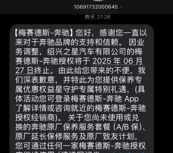 近日,一位奔驰车主告诉笔者,收到了标注为“梅赛德斯-奔驰”发送的短信。该短信称,因为业务调整,宝利德集团旗下绍兴之星汽车有限公司的梅赛德斯-奔驰授权将于2025年6月27日终止。车主原厂保修保养套餐可到任何一家梅赛德斯-奔驰授权店继续使用,而车主购买的仅限宝利德集团兑付使用的售后产品,只能联系该集团进行后续协商。