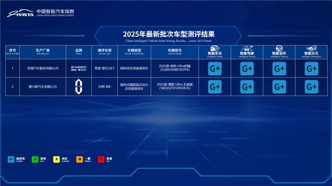 IVISTA中国智能汽车指数2023版修订版规程于今年3月正式实施,根据智能汽车的功能特点,分为智能安全、智能驾驶、智能泊车、智能交互四个分指数。本次是修订版新规正式实施后首次结果发布,共有两款车型,分别是星途星纪元ET、问界M8。两款车型在四个分指数中均获得G+评级。