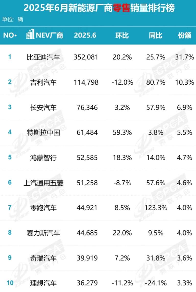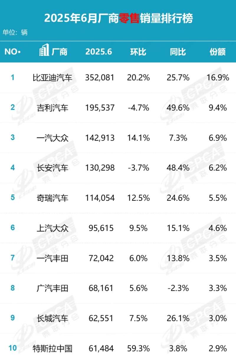 乘联分会公布的6月零售数据显示,当月销量排名前十的企业中,比亚迪仍以352081辆的成绩排名第一,同比上涨25.7%,市场份额达到16.9%。比亚迪的王朝网和海洋网是销量担当,腾势、方程豹的高端车型发力,助力品牌销量持续提升。