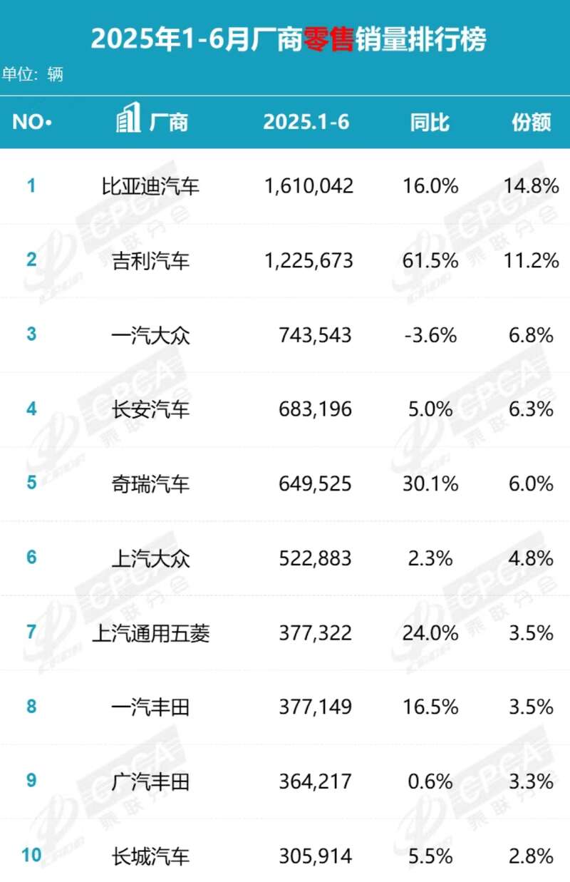 一汽-大众位列第三,其也是唯一进入前五的合资品牌。6月零售达142913辆,同比增长7.3%。在新能源转型的大环境下,一汽-大众的燃油车依旧稳扎稳打,通过技术升级和服务体系优化等措施,实现了燃油车份额逆势提升。