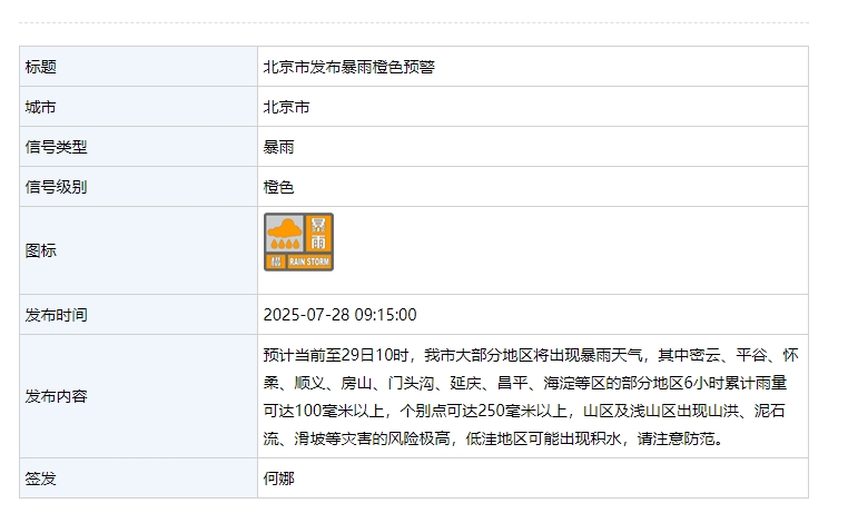 央视网消息:北京市气象台2025年07月28日09时15分发布暴雨橙色预警信号:预计当前至29日10时,北京市大部分地区将出现暴雨天气,其中密云、平谷、怀柔、顺义、房山、门头沟、延庆、昌平、海淀等区的部分地区6小时累计雨量可达100毫米以上,个别点可达250毫米以上,山区及浅山区出现山洪、泥石流、滑坡等灾害的风险极高,低洼地区可能出现积水,请注意防范。