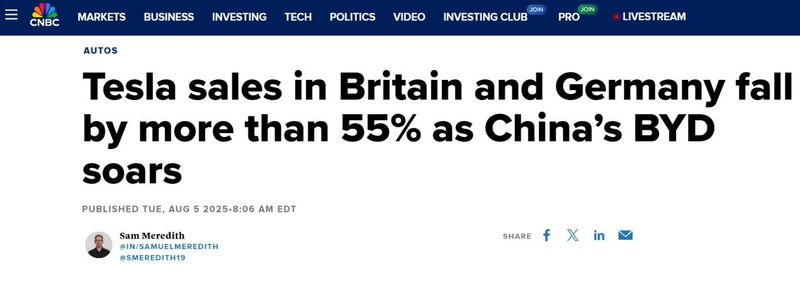 据英国汽车制造商和贸易商协会(SMMT)公布的数据,特斯拉7月份在英国的新车销量从去年同期的2462辆下降至987辆,降幅接近60%。在德国,特斯拉7月份的销量降至1110辆,较2024年同期下降55.1%。德国道路交通机构KBA的数据显示,2025年1月至7月,特斯拉在德国的销量暴跌57.8%,至10000辆。
