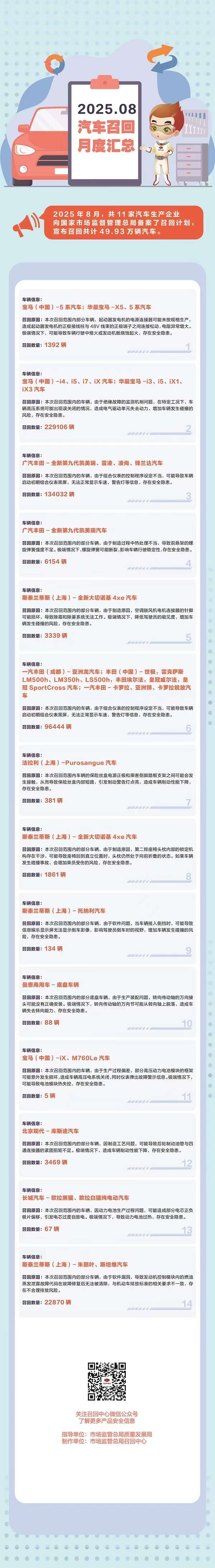 中新经纬9月10日电 国家市场监管总局网站10日披露《2025年8月汽车召回月度汇总》指出,2025年8月,共11家汽车生产企业向国家市场监督管理总局备案了召回计划,宣布召回共计49.93万辆汽车。