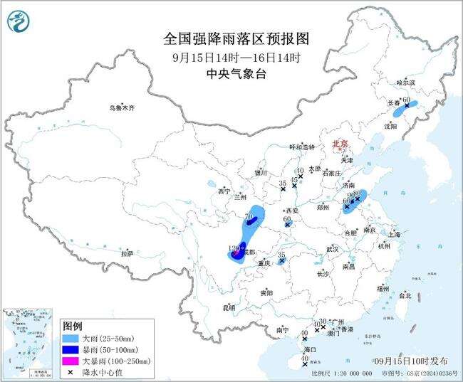 预计,9月15日14时至16日14时,甘肃南部、四川盆地西部以及山东南部、河南东部、安徽北部、江苏北部等地部分地区有大到暴雨,其中,四川盆地西部等地部分地区有大暴雨(100~120毫米)。上述部分地区伴有短时强降水(最大小时降雨量20~50毫米,局地可超过70毫米),局地有雷暴大风等强对流天气。
