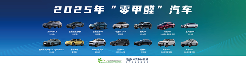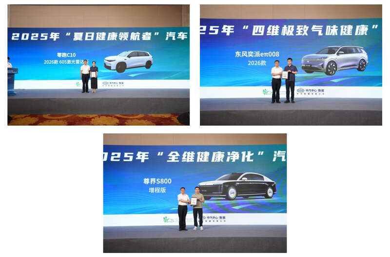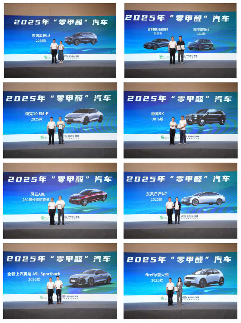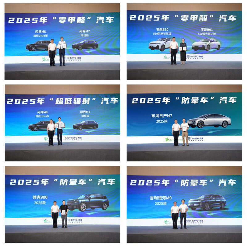 零甲醛”汽车:获奖车型在实际用车环境中,车内甲醛释放浓度达到与大气环境相当的水平,为驾乘者提供更安心的呼吸环境。本次共有13款车型获此殊荣:东风风神L8(2026款)、吉利银河星耀8(2025款)、吉利银河M9(2025款)、领克10 EM-P(2025款)、极氪9X(Ultra版)、奇瑞风云A9L(260超长续航尊贵版)、东风日产N7(2025款)、全新上汽奥迪 A5L Sportback(2026款)、宝骏享境(豪华版)、firefly萤火虫(2025款)、问界M8(增程Ultra版)、问界M7(增程版)、零跑B10(510悦享智驾版)、零跑B01(550激光雷达版)。