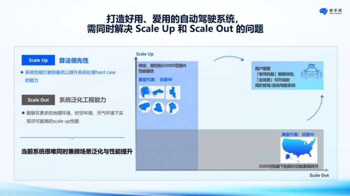 针对这些挑战,吕鹏提出核心解决方向:突破 “Scale Up” 与 “Scale Out” 两大关键点。其中,“Scale Up” 要求系统上限足够高,需通过算法领先性,将性能打磨至最优,以应对复杂场景、保障安全,类似传统 Robotaxi 公司在特定小区域实现的高水准无人运营能力;“Scale Out” 则强调地域覆盖广度,需依靠工程领先性提升泛化能力,避免如 Robotaxi 局限于小区域的问题,确保在更多地理、时空、天气环境下,仍能保持高水准性能 —— 二者结合,才能攻克城区辅助驾驶乃至自动驾驶的 “珠穆朗玛峰”。