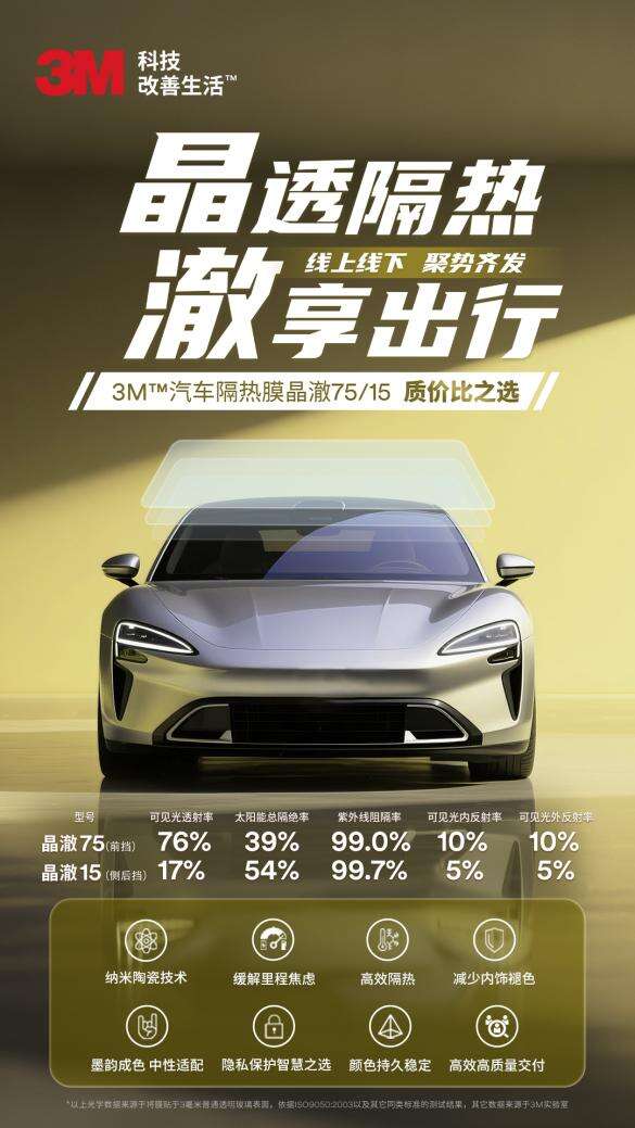 深耕汽车膜领域多年的3M,始终以创新科技回应消费者的真实需求。3M™汽车隔热膜晶澈系列,自去年上市以来广受好评,凭借优异的性能,迅速成为务实且追求品质的车主的不二之选。