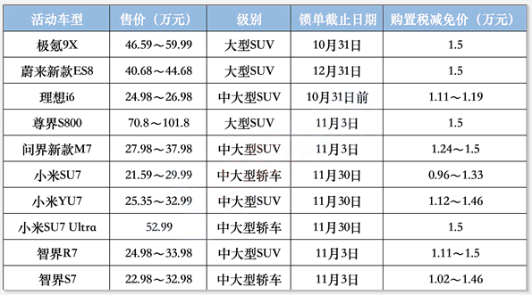 随着新能源汽车购置税减半征收政策的临近,不少车企都在近期发布了购置税兜底活动,即对部分交车时间在2026年以后的热销新车,采取限时补贴至高1.5万元购置税的举措,大部分活动都在11月结束。