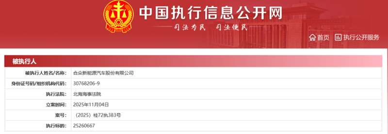中新经纬11月5日电 中国执行信息公开网显示,哪吒汽车母公司合众新能源汽车股份有限公司(下称“合众新能源”)新增一则被执行人信息,执行标的超2526万元。