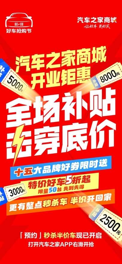 作为汽车之家商城上线后的首次年度大促,本次“11.11好车抢购节”依托15家品牌资源与海尔战略入股、天猫汽车战略合作优势,优惠力度史无前例。汽车之家深耕行业20年,APP累计下载量5亿,影响50%以上汽车交易,平台实力背书,购车更靠谱。