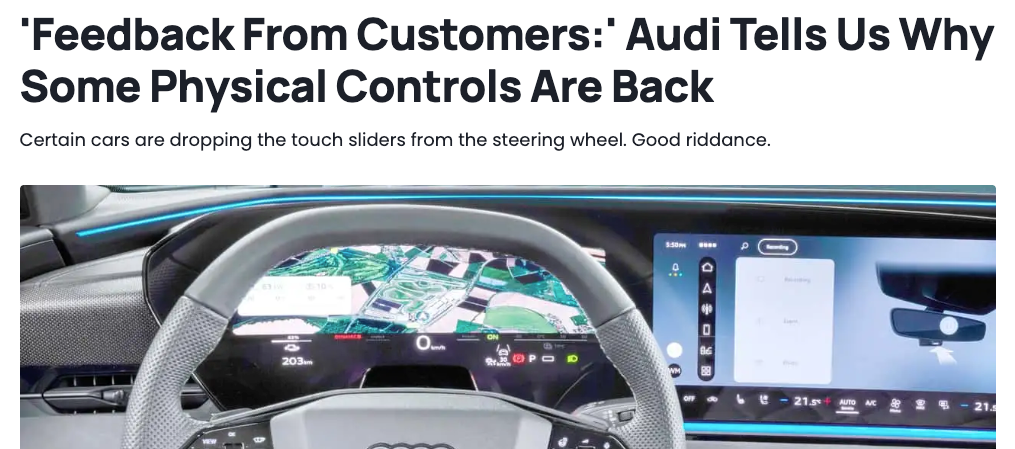 此次调整覆盖奥迪A5、Q5、A6燃油版、A6 e-tron纯电版及Q6 e-tron纯电SUV,外媒认为,这也是豪华品牌在智能化浪潮中重新审视用户对传统操作方式的深层需求。