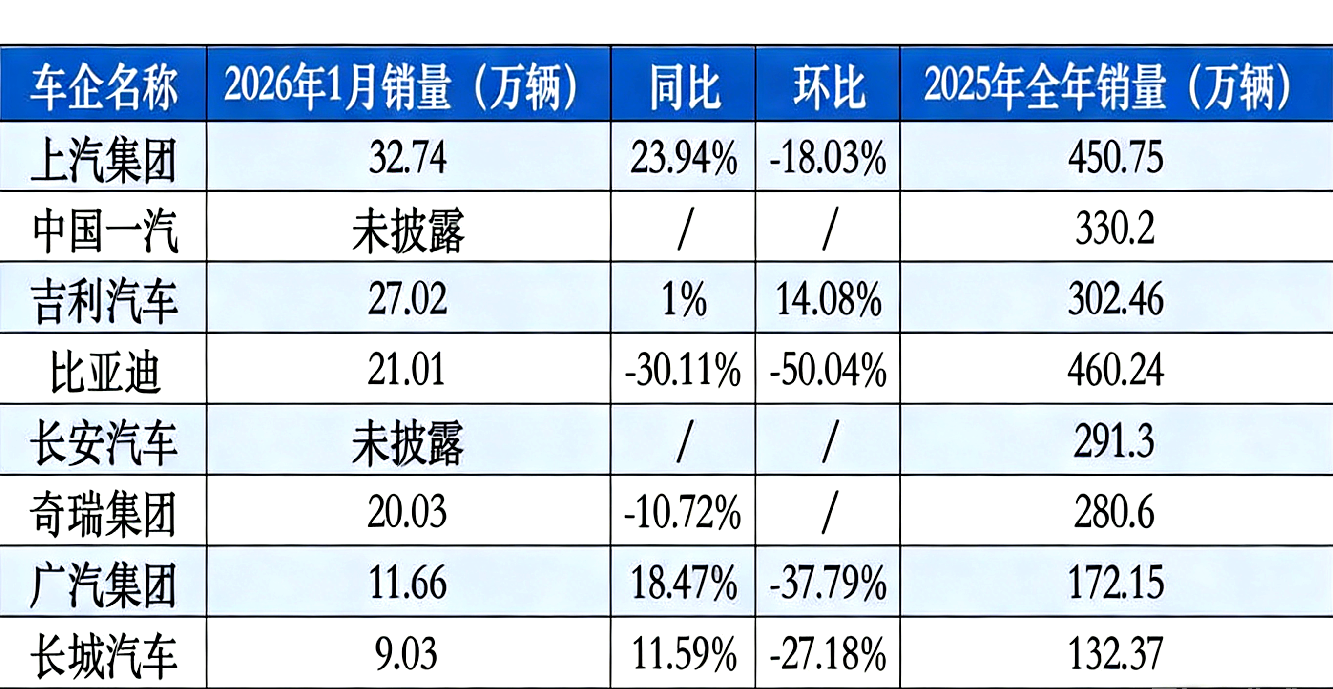 从各家车企销量数据来看,比亚迪近两年全年销量稳坐中国车企头把交椅,仅个别月份销量被上汽集团反超。不过,2026年1月,反超比亚迪的队伍又新增了成员。